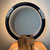 Kleine sfeerlamp van gerecyclede remschijf en massief houten lamphouder.